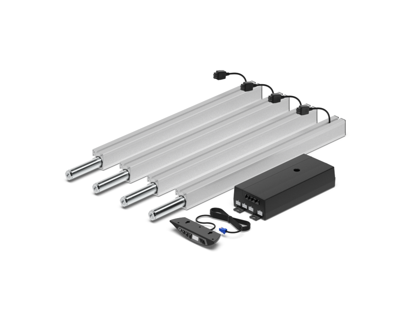The SQ four-leg electric lift system provides 12” (300 mm) of height adjustment for medium to heavy-duty workstations. Its compact anodized aluminum columns include dual 8 mm T-slots for easy integration. Delivered as a complete, ready-to-install kit with four columns, remote, controller, and leveling feet.
