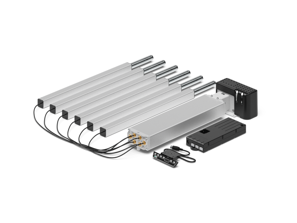 1x Pump PB 6830 H with motor, 1 x controller with 10 ft power cable, 1 x memory remote control, 6x Linear unit LA 1430 with 10 ft (3m) Tubing, 6x leveling feet M10x25, 1 x drilling template and tubing mounting hardware.